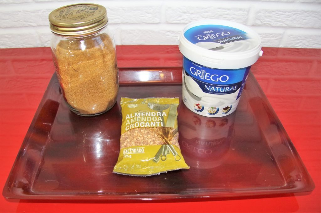 Mezclar el yogur, el azúcar moreno y el crocanti de almendra en un bol.