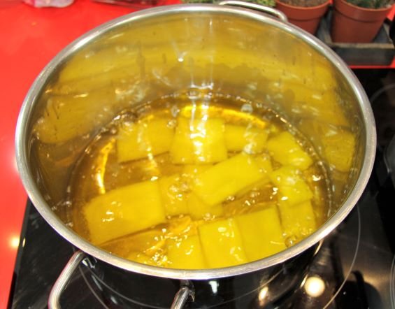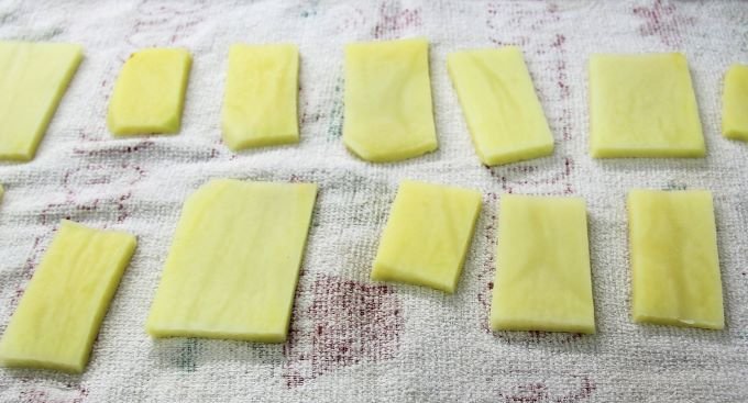 LAS CORTAMOS CON UNA MANDOLINA EN RODAJAS DE UNOS 2-3 MM Y LAS PONEMOS EN AGUA DURANTE UNA HORA.