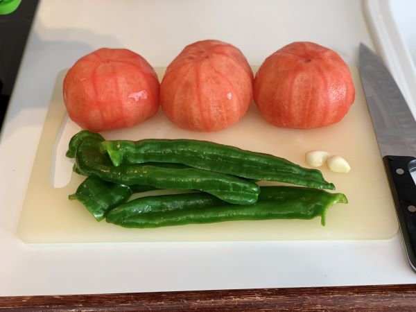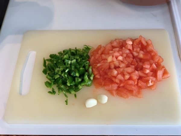 Pelamos los tomates, se le quitan las semillas dejando solo la carne, limpiamos el ajo y los pimientos quitándoles el corazón y las semillas.
