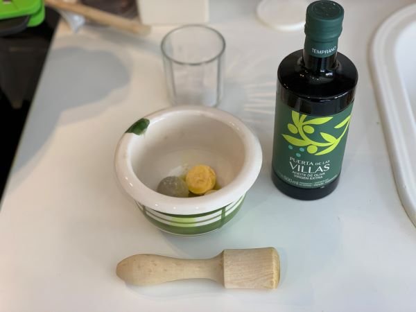 Una vez pelados los huevos, retiramos dos de la yemas al mortero para hacer un majado junto con la sal, aceite y vinagre. - Usar una aceite de la máxima calidad que puedas conseguir.