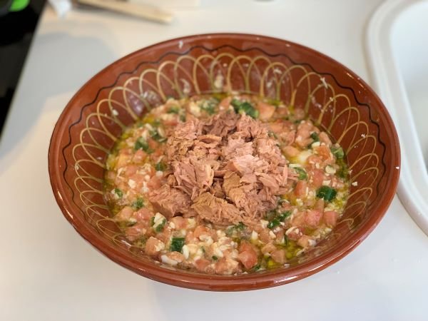 Hay otra pipirrana exquisita que se toma en invierno con los tomates en conserva que solía hacerse en verano, esta es imprescindible la cebolleta tierna, los demás ingredientes al gusto de cada uno, atún, huevo, etc, son opcionales.