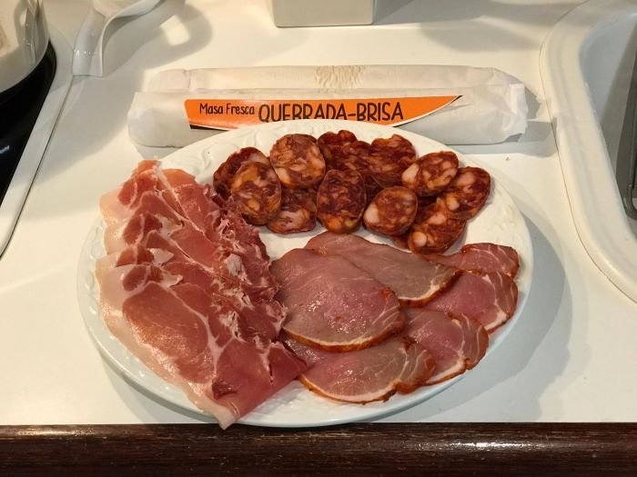 Se coloca la primera parte de la masa sobre el papel vegetal y se pincha varias veces con un tenedor, colocando encima el chorizo, el lomo y por último el jamon.