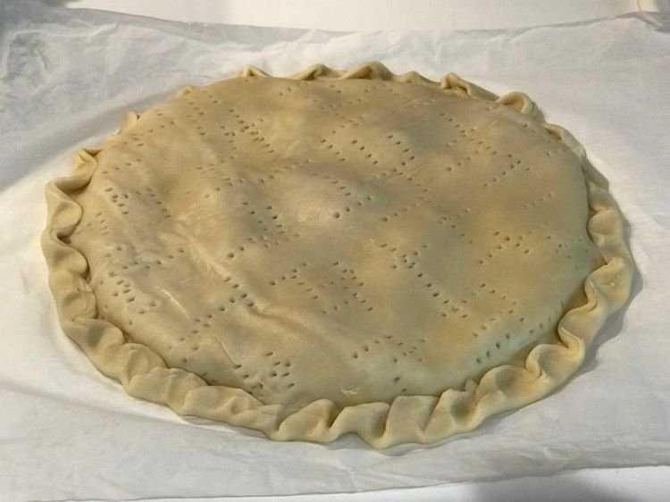 A continuación se coloca encima la segunda parte de la masa, unimos, pinchamos con un tenedor y hacemos un corte de un cm. en el centro para que salga el aire y pintamos con el huevo batido.