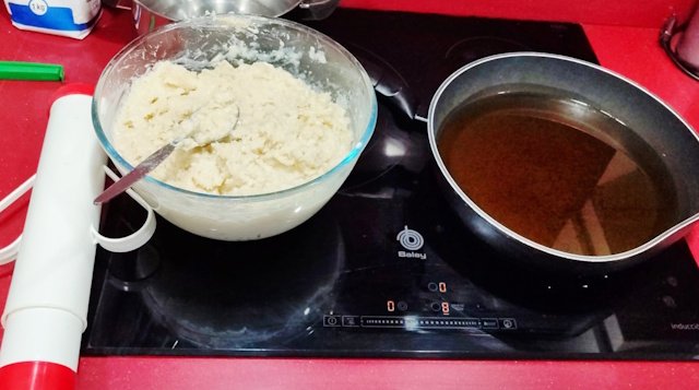 Le vamos añadiendo el agua poco a poco a la vez que vamos removiendo con la cuchara, importantísimo que el agua esté hirviendo, hasta que la masa esté terminada y sin grumos.