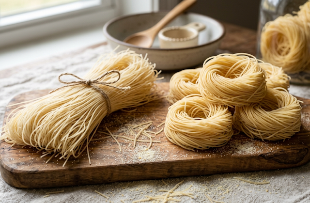 - Presentación: Se suele vender en hilos rectos largos (como los espaguetis) o enrollado en forma de pequeños nidos.